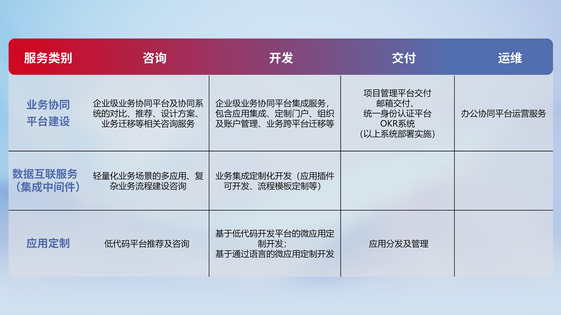 针对钉钉、、企微、、、、IDaas等平台级产品提供产品的规划、、方案、、、、交付、、、、定制化开发等服务,,,实现如统一协同办公、、智能客户服务、、、混合会议管理、、、、智能数据查询、、、、等业务场景,,,实现数字化转型。。